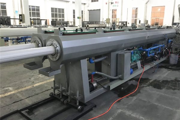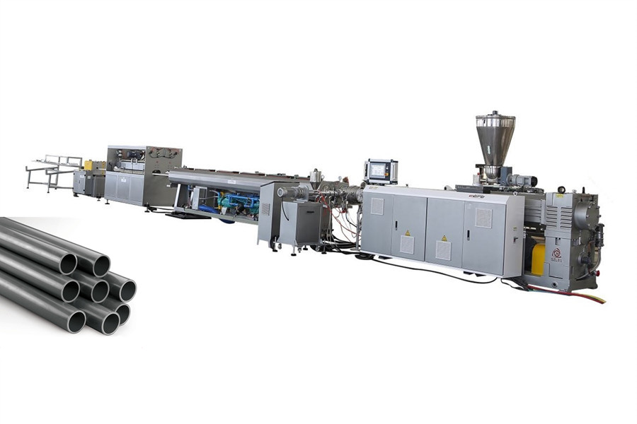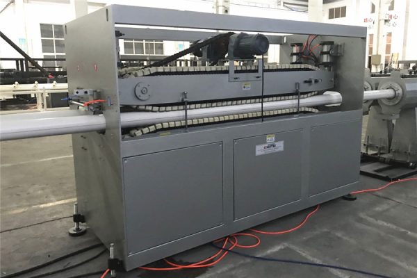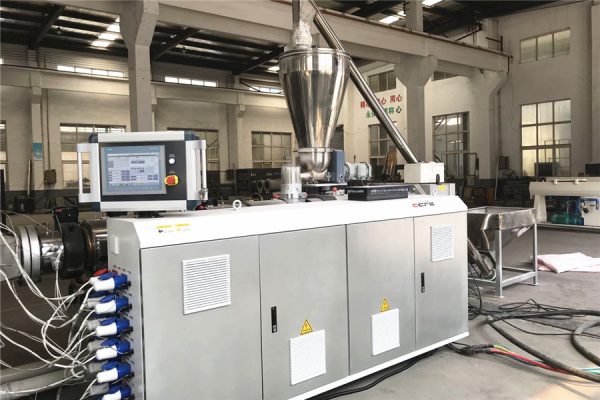 这条生产线用于生产聚氯乙烯管材。主挤出机采用锥形双螺杆挤出机,可选择不同产量的挤出机。