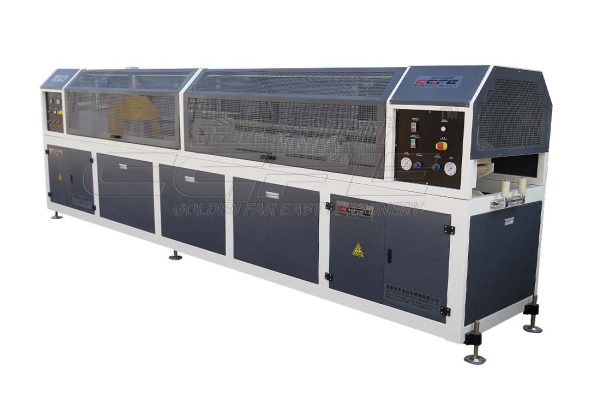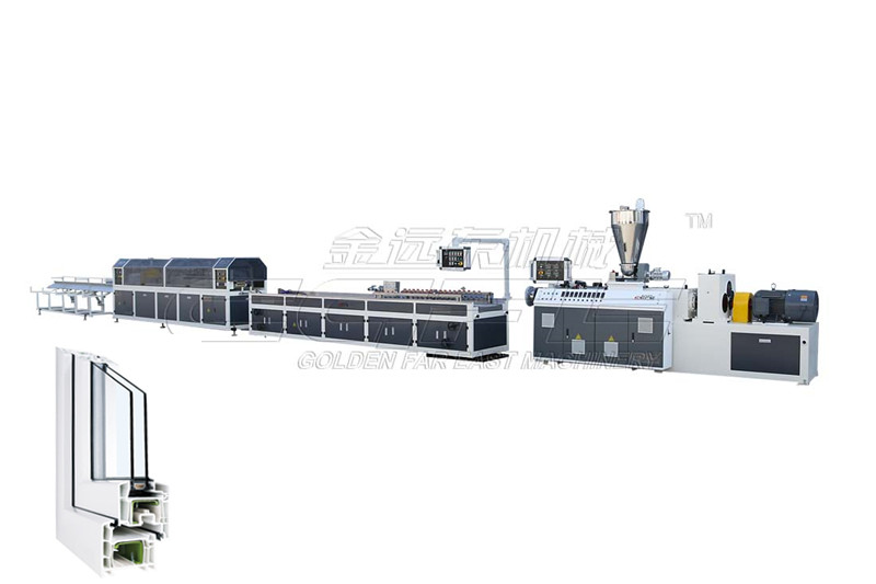 PVC Window & Door & Windowsill Profile Production Line is optimized in design, referring to the newest foreign technology. This unit has the advantages of plasticizing even, small speed ratio of cutting, high output, long use-life and so on. The unit is composed of cone double-screw extruder, vacuum calibration table, puller, cutting machine. The main machine adopts the inverter or DC speed counter. Temperature controller adopts FUJI, OMRON etc. co-extruder is optioned.