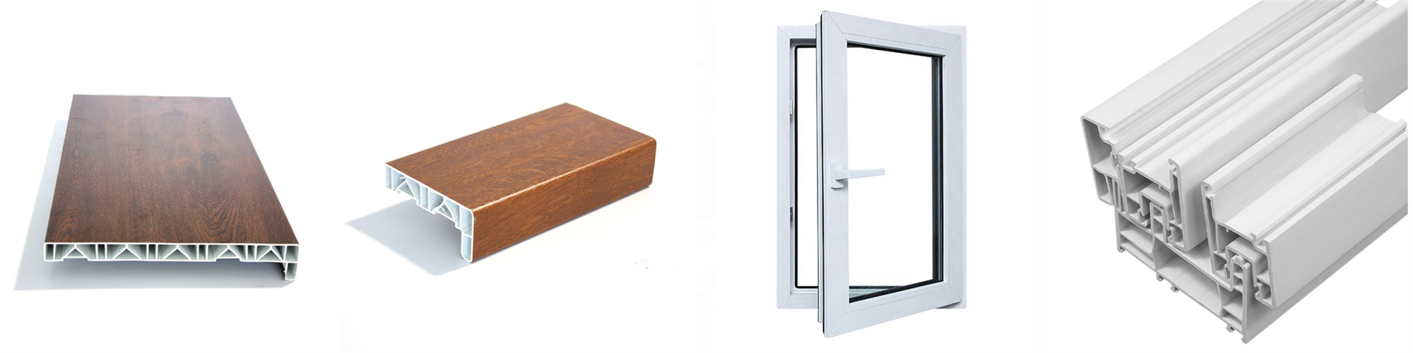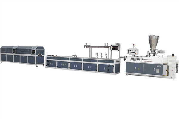 这套生产线包括锥形双螺杆挤出机、模具、真空定型台、牵引切割机、堆放架。 模具根据客户的样品图纸设计。 可生产不同的PVC型材;PVC型材包括:PVC门窗型材、PVC窗台、PVC柜门、PVC雨水槽、PVC门等。 机器可以通过手动操作或PLC控制来选择。